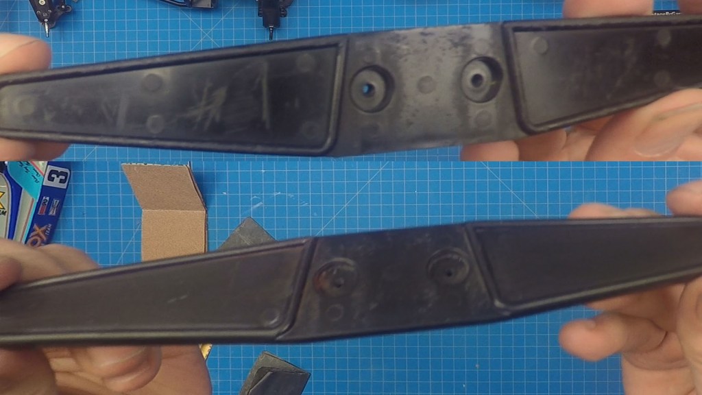 When I started the build I used a NOS front bumper since the original had some wear. Near the end of the build I decided to refurbish the original instead since it still had the decals installed. The original had some deep scratches that needed to be removed. I started by taping off the decals to protect them and then hit it with 100, 150, 220, 320, 1000, 1500 grit sand paper. Lastly a quick buff on the buffing wheel to finish it off.